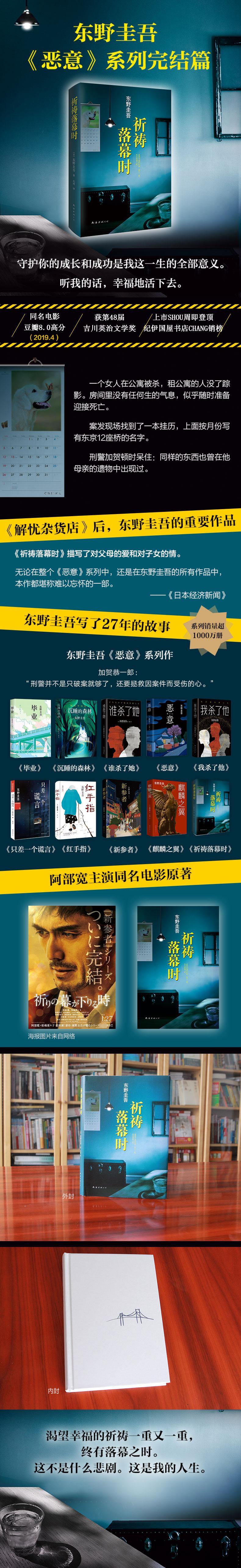 《祈祷落幕时》可谓是东野圭吾近几年创作的罕见的亲情佳作,甫一出版即受到读者和评论界广泛好评,上市周即登上日本很大书店——纪伊国屋销售榜名,并于2014年3月获得第48届吉川英治文学奖。《祈祷落幕时》以东野笔下很重要的角色“刑警加贺恭一郎”为主角,延续了加贺系列解谜与感人并重的风格,通过一起看似普通的案件,牵扯出两个关于爱的悲欢故事,四段相互交织的震撼人生。在《祈祷落幕时》中,东野用细腻深沉的笔触,讲述父母为了儿女的幸福做出种种牺牲与努力,令人动容。有日本读者评论道:《祈祷落幕时》可以和《红手指》《新参者》《麒麟之翼》并称“家族4连作”,在《祈祷落幕时》中再次找到了东野圭吾的“魂”。此外,《祈祷落幕时》不仅解开了《毕业》《红手指》中所提及的加贺母亲失踪之谜,还说明了很好的加贺为何坚持在日本桥警察局任职的原因,喜欢加贺的读者保证不可错过。
