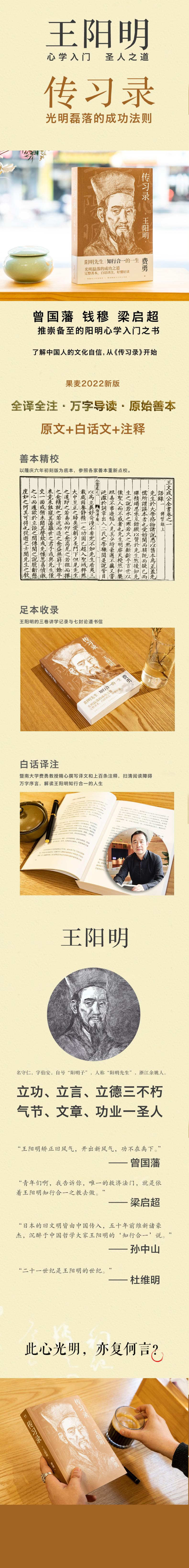 《传习录》是的问答语录和论学书信集,集中而系统地阐释了阳明**心即理、致良知、**的内涵,是一部简明而有代表性的古典哲学著作。它所阐述的修身、养心、处世之道对于现代生活依然有巨大的指导意义,可以说,这是一本充满实践性的生活哲学读本。