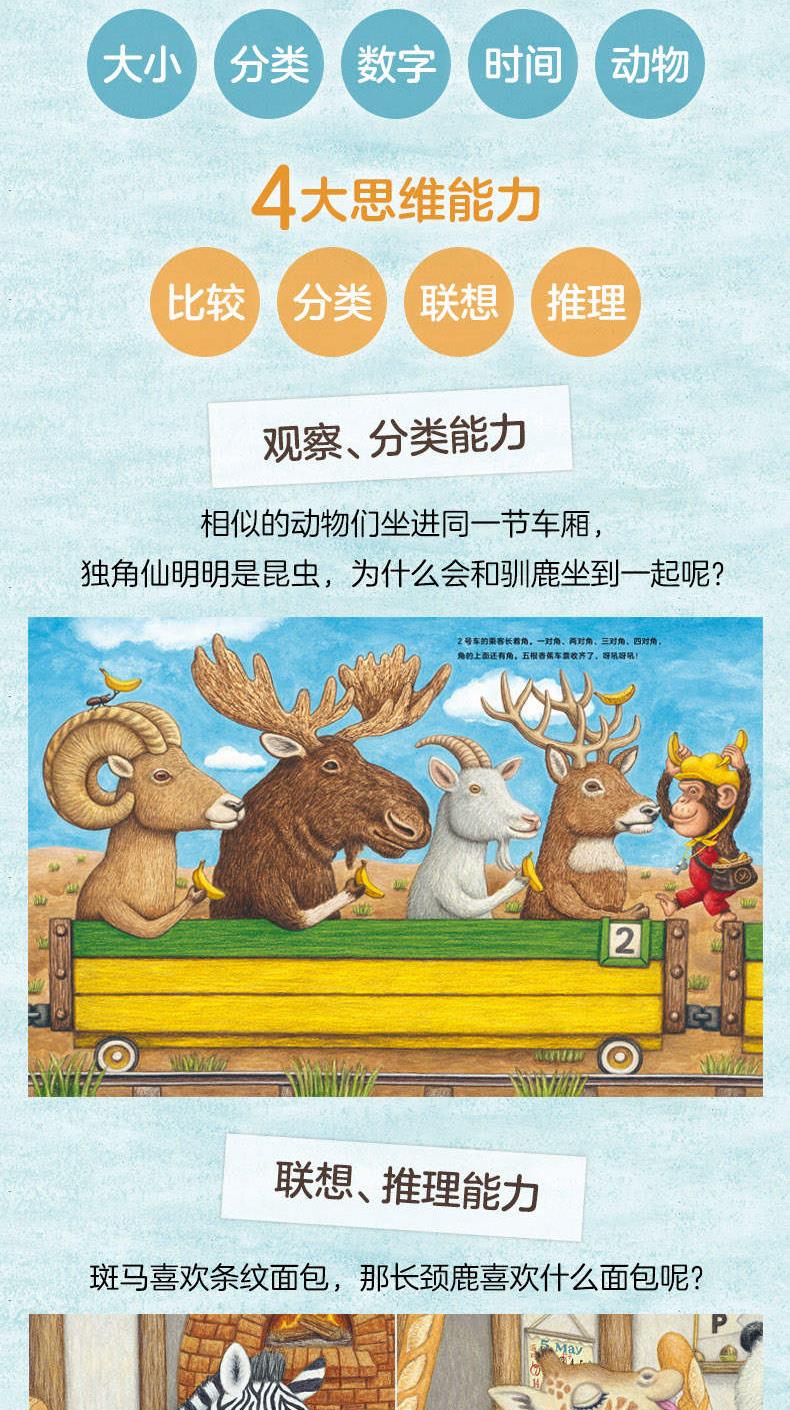 【锻炼思维】融入大小、分类、数字、时间和动物等知识,锻炼孩子比较、分类、联想等思维能力,在故事中引导孩子思考。