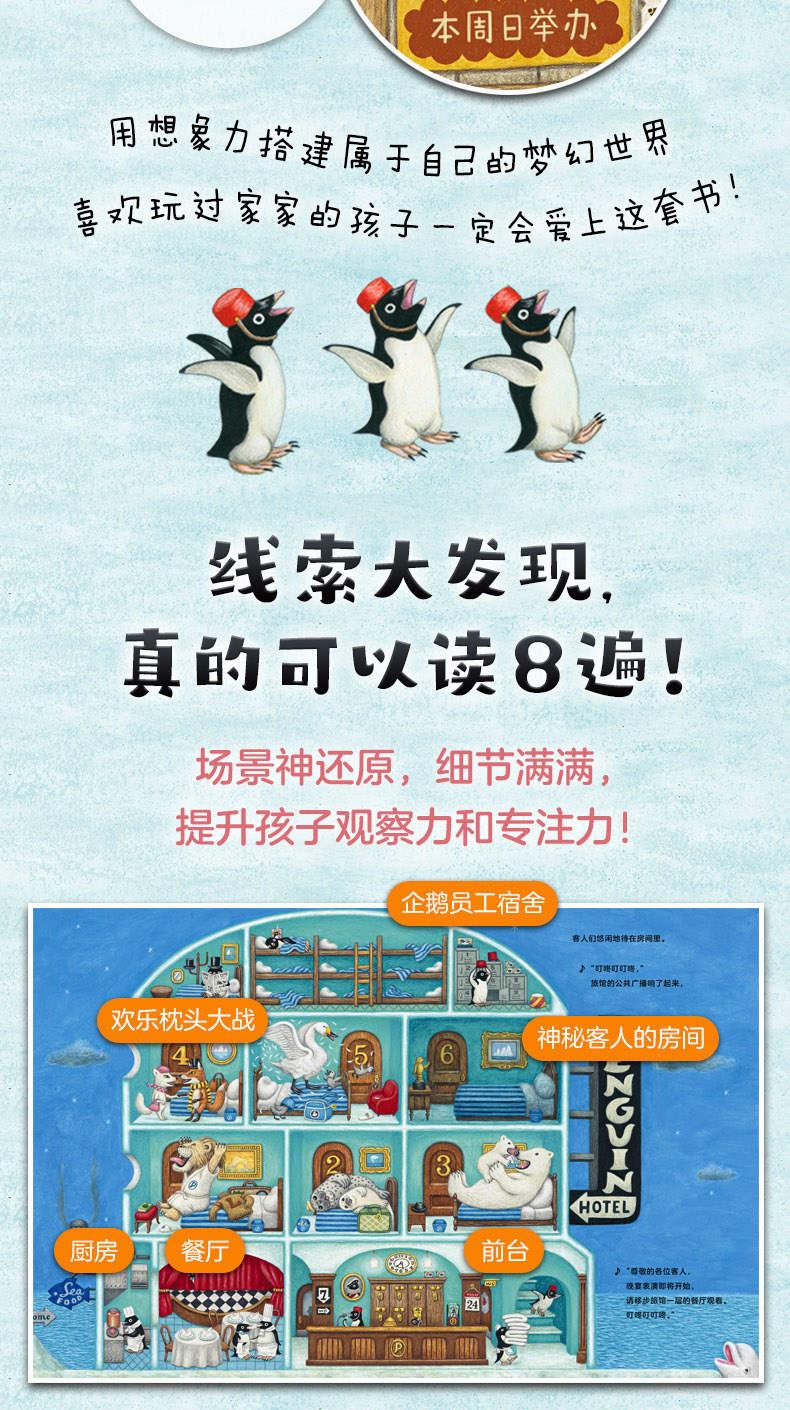——首先自由读故事!第2遍,边看边玩细节大发现!第3遍,认一认中英对照物品图鉴!第4遍,来玩角色扮演!第5遍,选一位动物客人,讲讲它的一天!第6遍,故事大接龙!第7遍,聊一聊,边读边选房间!第8遍,动手做只小企鹅,一起来玩过家家!