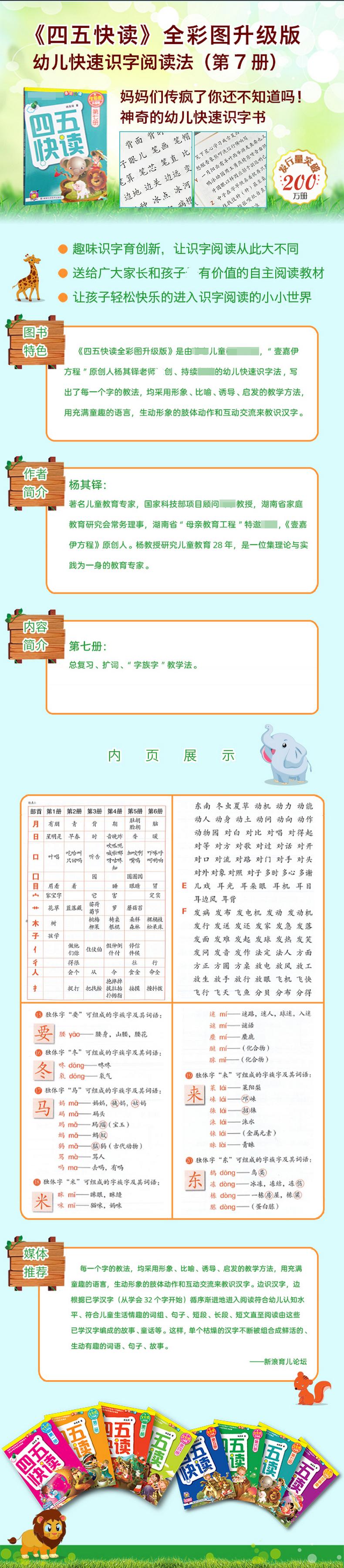 《四五快读(全彩图升级版)(第7册)》的识字特点是:作者写出了每一个字的教法,均采用形象、比喻、诱导、启发的教学方法,用充满童趣的语言,生动形象的肢体动作和互动交流来教识汉字。边识汉字,边根据已学汉字(从学会32个字开始)循序渐进地进入阅读符合幼儿认知水平、符合儿童生活情趣的词组、句子、短段、长段、短文直至阅读由这些已学汉字编成的故事、童话等。这样,单个枯燥的汉字不断被组合成鲜活的、生动有趣的词语