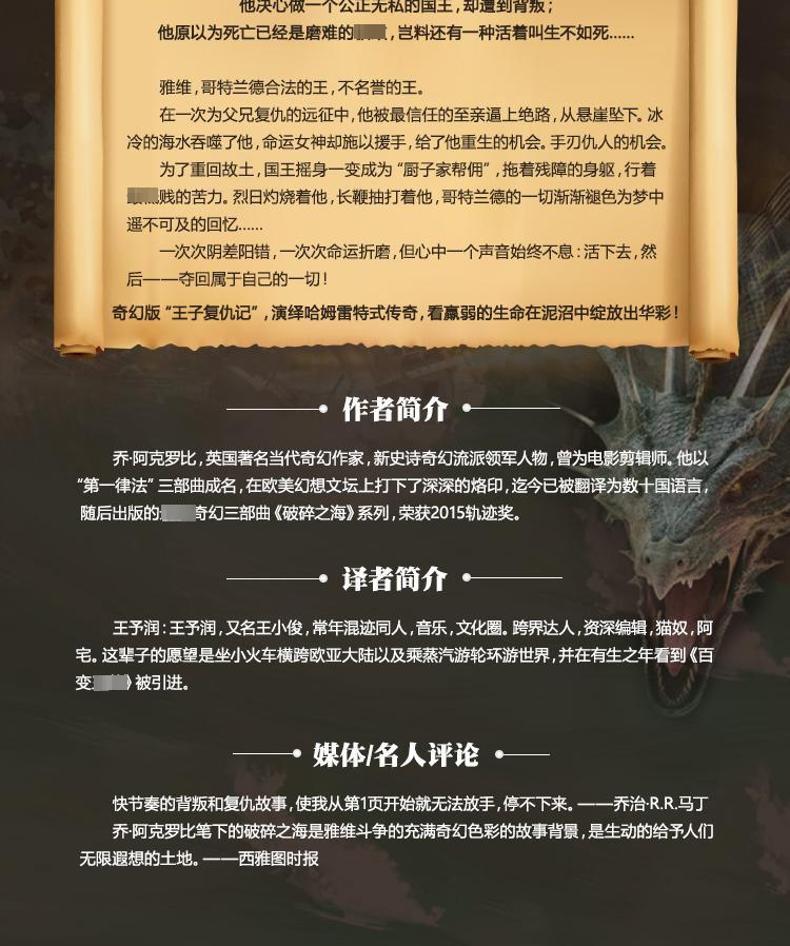 快节奏的背叛和复仇故事,使我从页开始就无法放手,停不下来。――乔治R.R.马丁
