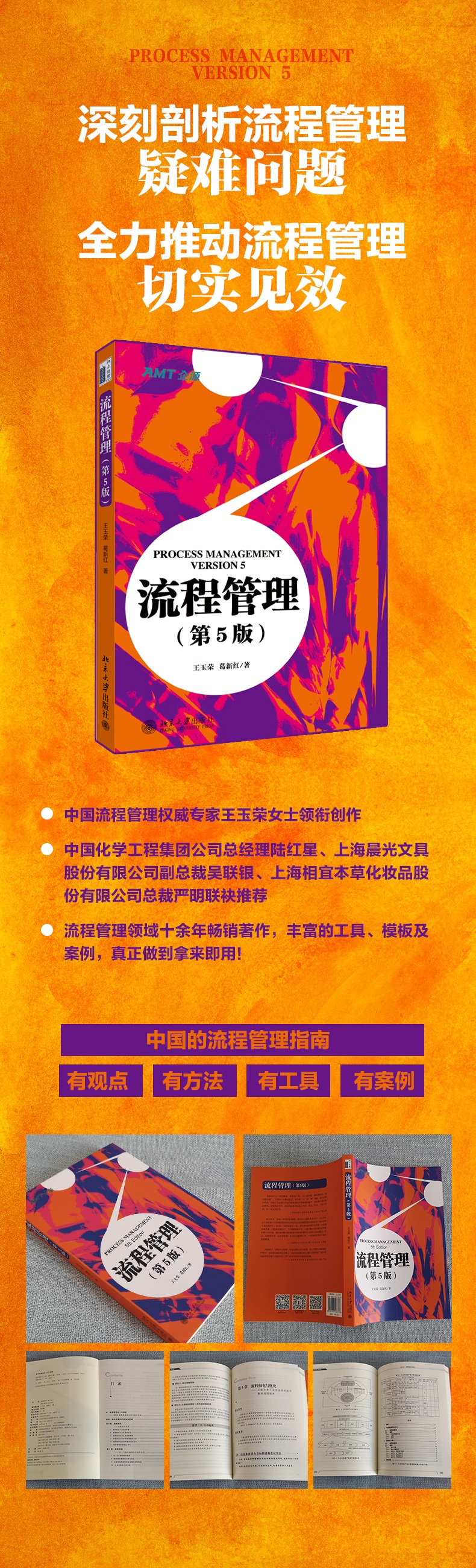 经过10多年的努力和积累,AMT已经累计为2 000多家企业提供过流程优化咨询建议,并将理论研究和咨询实践,不断著书成文,出版了《流程管理》(第1版、第2版、第3版、第4版,其中第4版名为《流程革命2.0——让战略落地的流程管理》),并根据不同细分读者的需要,出版了《流程管理实践案例》《跟我们做流程管理》《图说流程管理》等。这些书籍的出版是我们不断总结与创新的成果,也是对企业在流程管理实践中一些共性问题的不断提取和归纳,希望能给更多的正在进行流程管理的企业参考和借鉴。