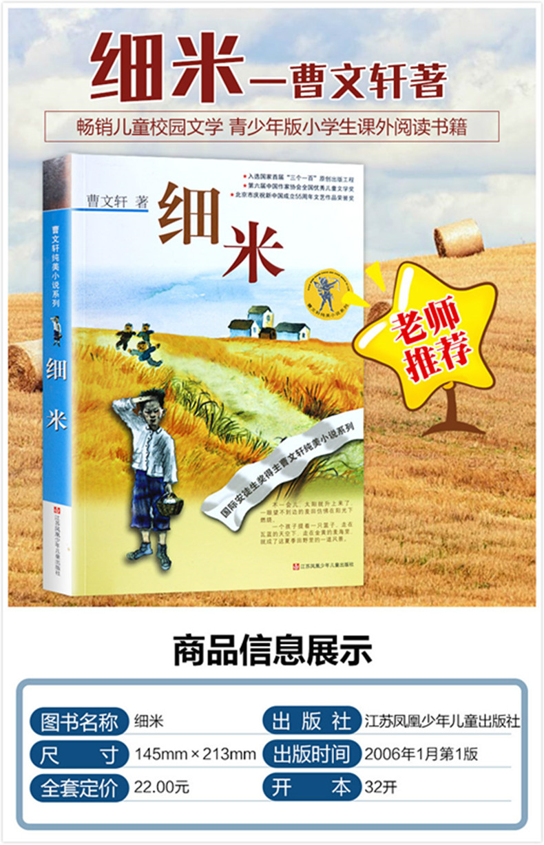 《细米》里讲的少年细米生来就是一个爱脸红的男孩儿,他与表妹红藕两小无猜,一同长大,日子如清水一般自然流淌。然而,有那么,大河上飘来一叶巨大的白帆,自帆下飘来了一群仿佛来自天国的女孩儿。这些从苏州城里来这里插队的女知青,给平静的乡村带来了一股新鲜而迷人的气息,而其中的梅纹姑娘以她纯净而温柔的情感与精神力量,使细米这个桀骜不驯的乡野之子步入新的成长历程。小说深谙人情与人性的微妙,写就了一段可以与日月同