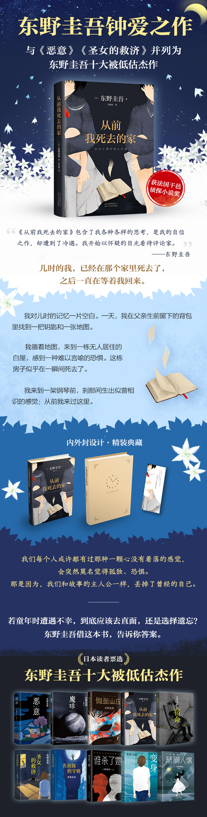 东野圭吾著的《从前我死去的家(精)》讲述了“我”对儿时的记忆一片空白。,“我”在父亲生前留下的背包里找到一把钥匙和一张地图。直觉告诉“我”,这把钥匙可以帮“我”找回记忆。 按照地图的指示,“我”来到一栋无人居住的白屋。一种难以言喻的恐惧压迫着“我”:未收拾的咖啡杯、没织完的毛衣、做到一半的作业、所有指针都停在同一时刻的钟表。这栋房子似乎在一瞬间死去了。 “我”来到一架钢琴前,刹那间