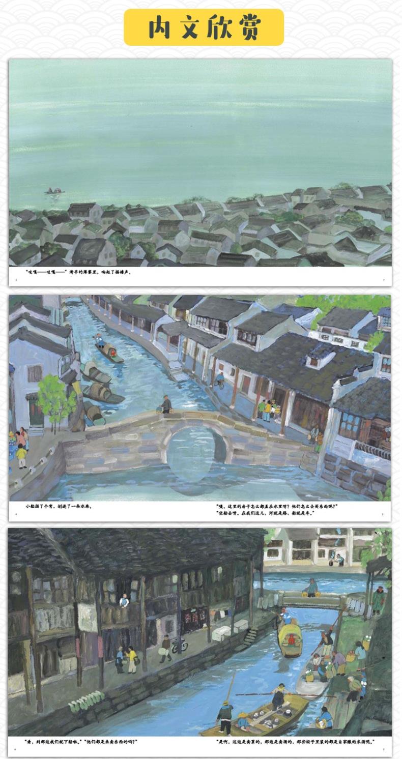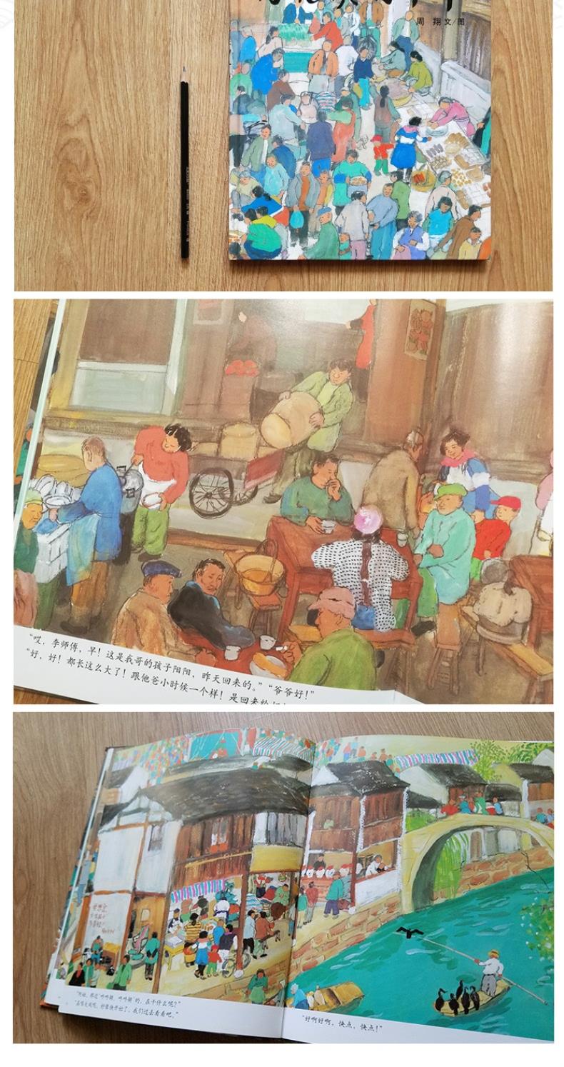 今天是奶奶70大寿,小男孩阳阳和姑姑一起到早市买东西。这个生活在大都市的小男孩对江南水乡独特的风情兴奋不已。作品从阳阳靠前次回到水乡给奶奶过70岁生日时的情景展开,通过阳阳的视角向读者们描绘出一派诗意盎然的水乡景色和朴素温暖的水乡人情。阳阳睁大好奇的双眼,看着都市生活里从未出现的新鲜事物和乡俗风情:米酒、小猪、斑驳的船影、刚出壳的小鸡、露天的大戏、接新娘的花轿……随着阳阳的视野,江南的诗意缓缓流淌